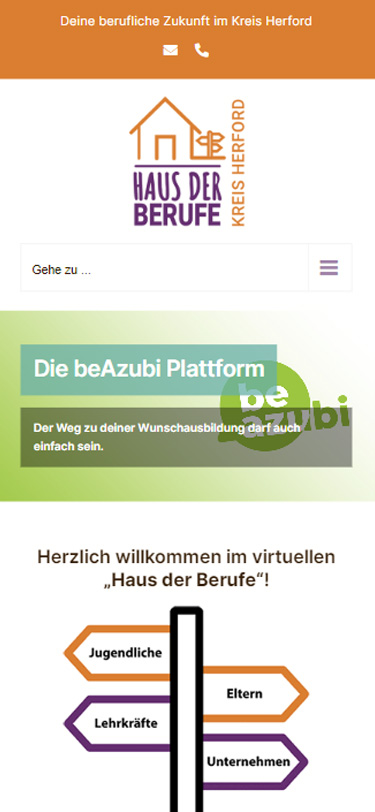 Im Auftrag des Kreises Herford entwickelten wir das Portal „Haus der Berufe“, in dem alles Wissenswerte zum Thema „berufliche Zukunft“ für Jugendliche, Eltern, Lehrkräfte und Unternehmen präsentiert wird. In Zusammenarbeit mit Grafikern und Projektverantwortlichen des Kreises entstand das Leitmotiv des Designs. Unternehmen und Partnerinstitutionen steuerten zusätzliche Inhalte bei, welche in das System integriert wurden. Thematisch passende Grafiken und kleine Animationen lockern die vielen Textinhalte auf. Ein wichtiger Baustein war die Verknüpfung mit dem Portal „beazubi“, über dessen App Schüler*innen und Ausbildungsplatzsuchende einfach Kontakt mit Unternehmen herstellen können.