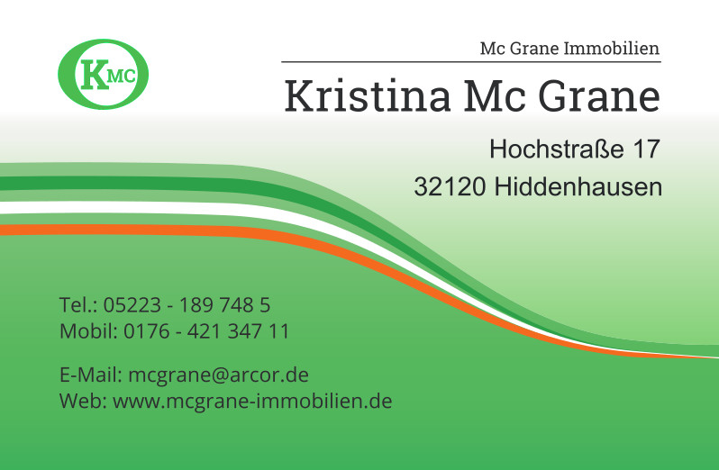 Für die Firma Mc Grane Immobilien aus Bünde gestalteten wir das Corporate Design inkl. Logo – anschließend Visitenkarten, Versandmappen und Flyer).