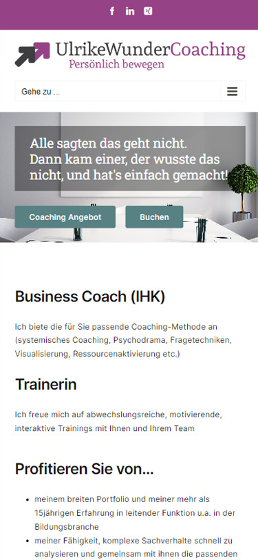 Dieses Redesign ihrer alten Homepage entstand für die Coachin und Trainerin Ulrike Wunder aus Weilerswist. Das frische Responsive-Design wurde mit aktualisierten Inhalten und dazu passenden Grafiken bestückt. Außer einem Kontaktformular und Social-Media-Verlinkungen wurde zudem der Buchungs-Service von Microsoft Bookings integriert.